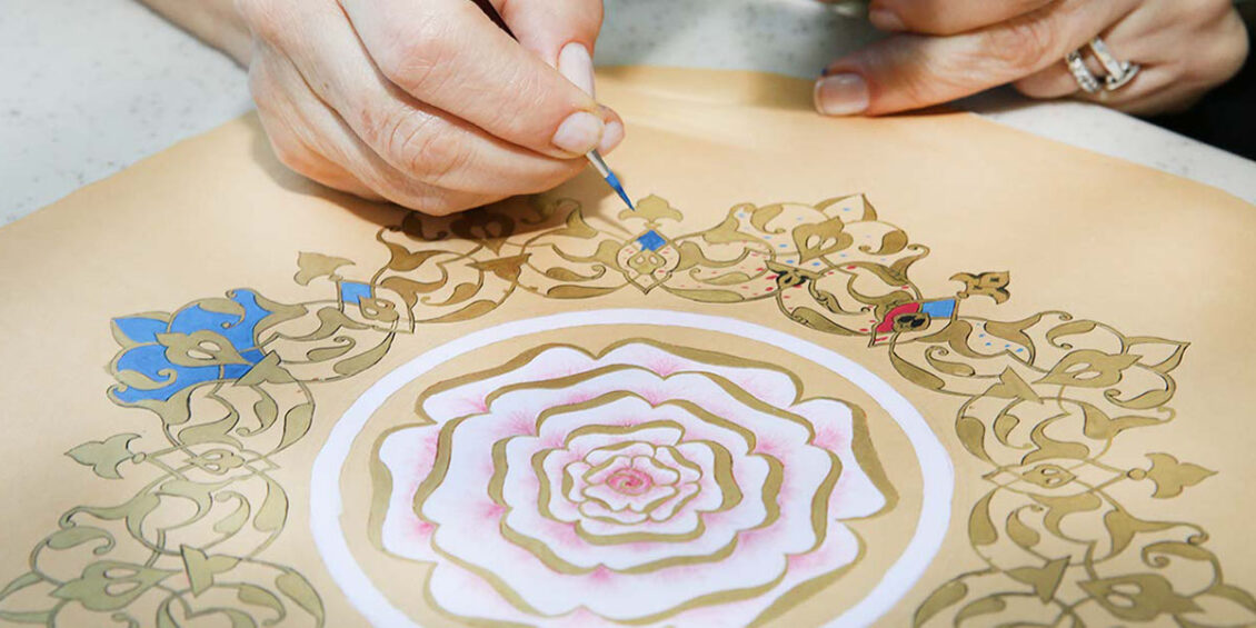 Making the gold paint requires a complicated process. First, gold in the form of a thin leaf is taken and mixed with the Arabic gum and water which is made into putty. By means of a finger or a special tool, finely shredded gold dust is brought to the paint consistency. Gelatinized water is used to stick to the surface. The pattern is drawn on the area to be illuminated and firstly a gold paint is applied. Then the golden parts are polished with the help of the “mühre (burnisher)” which has a polished agate on its edge, thus the gold shine is provided. It is usually done by contours of the half or quarter symmetrical pattern, then the patterns are painted one by one. Apart from gold, colors such as navy blue, red, pink, yellow, black, orange, blue and green shades are common in illumination. Lastly, crochet is drawn, details such as scattering and sweeping are added.